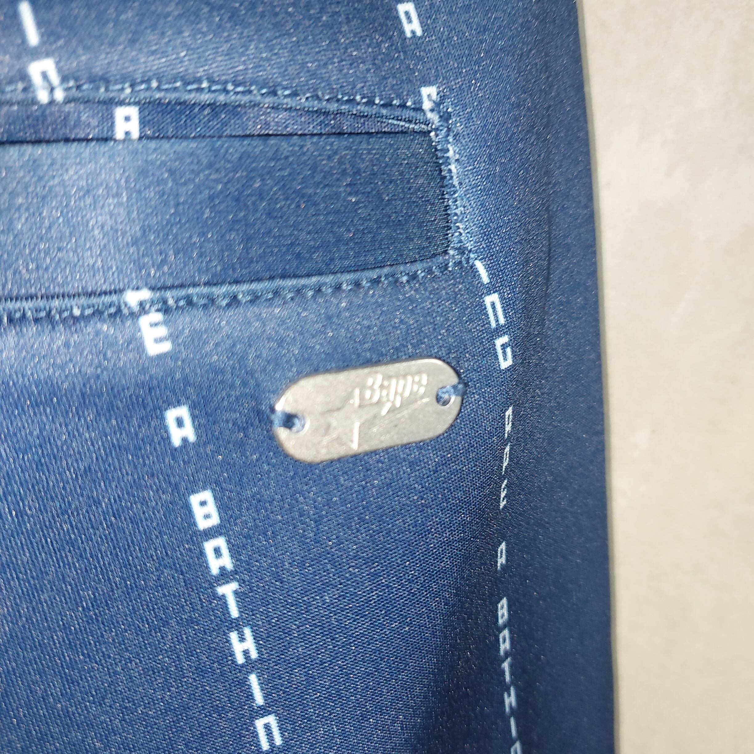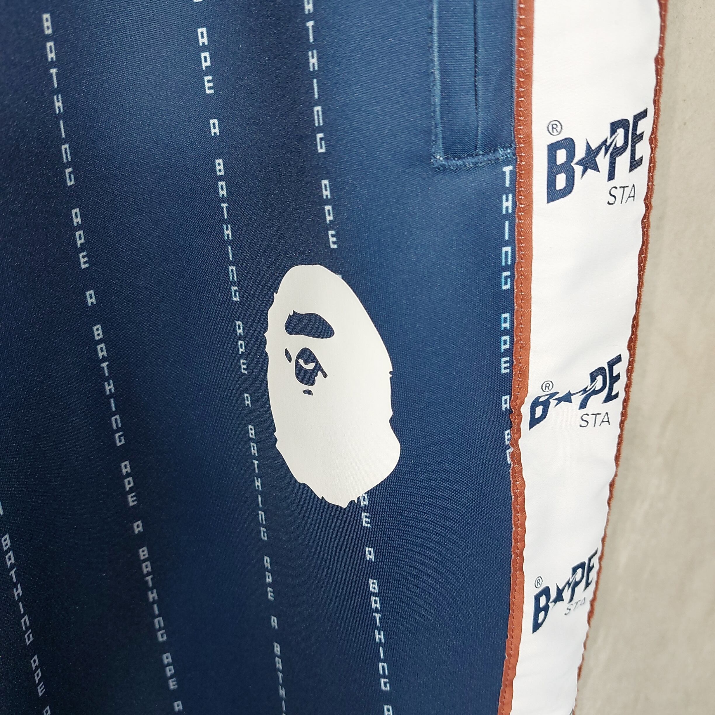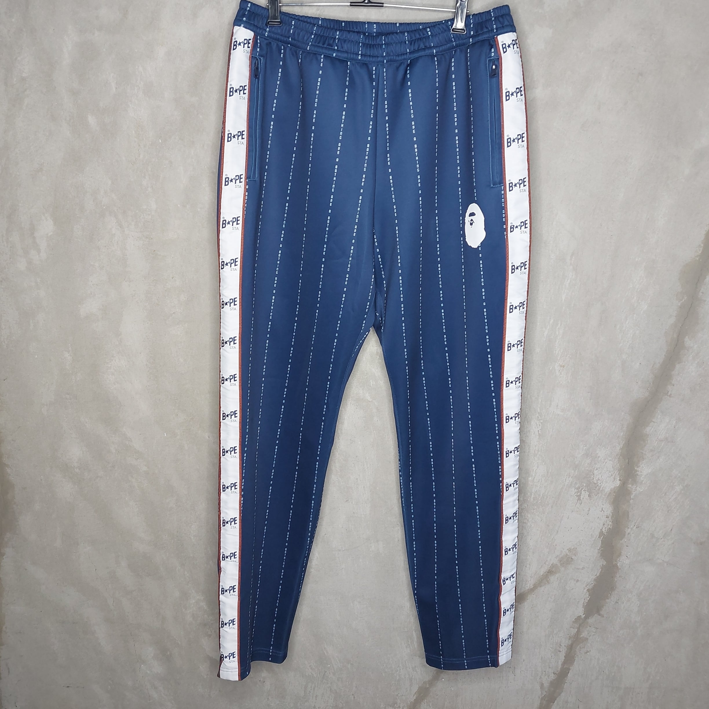 BAPEのストライプデザインジョガーパンツ、ネイビーのスタイリッシュな一着。