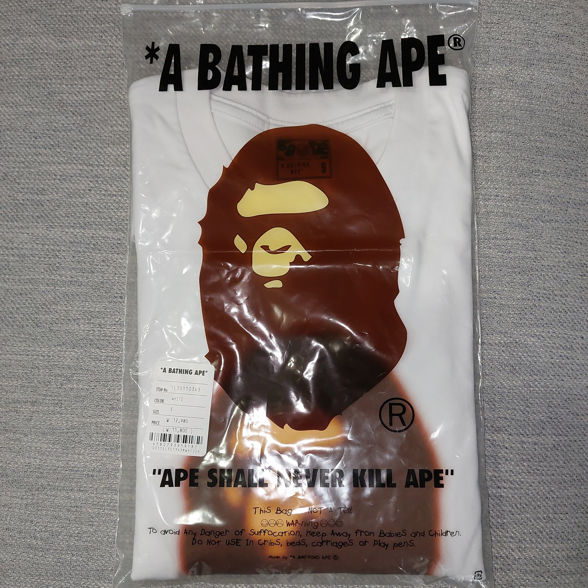 ホワイトのクルーネックTシャツにBAPEのロゴプリント。