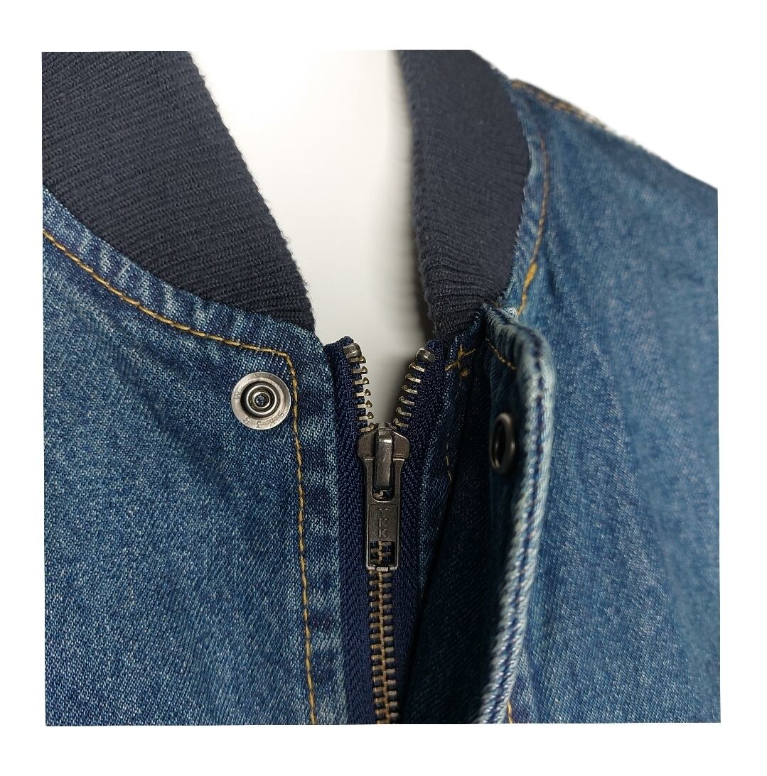 デニム素材のボンバージャケット、ジッパー付きポケットとリブ襟が特徴。
