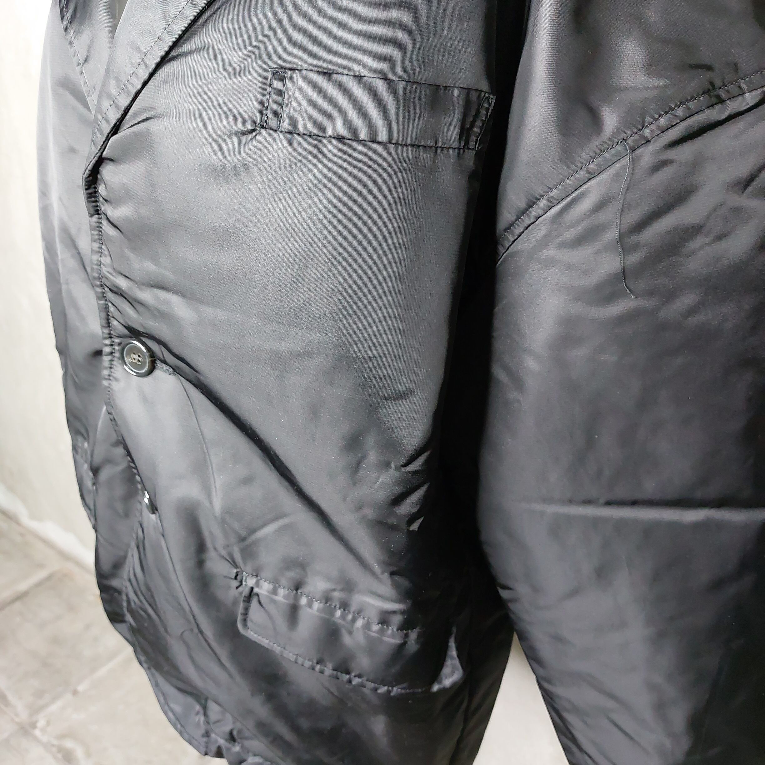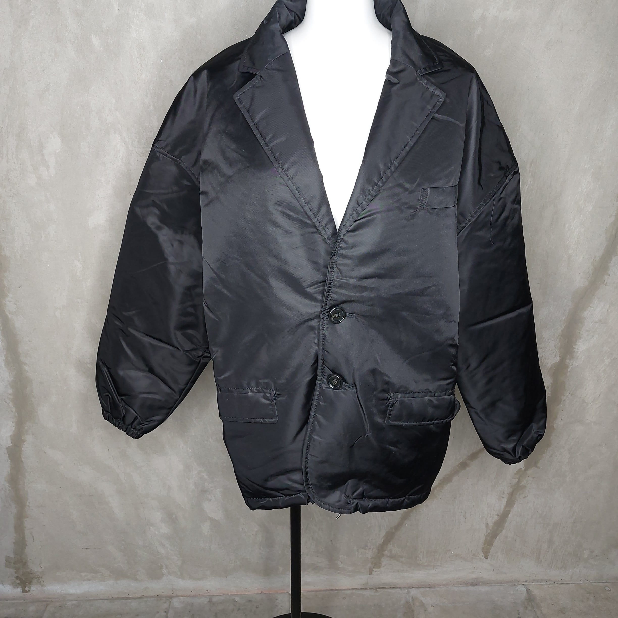 シンプルな黒のボタン付きジャケット、前面に2つのポケット付き。