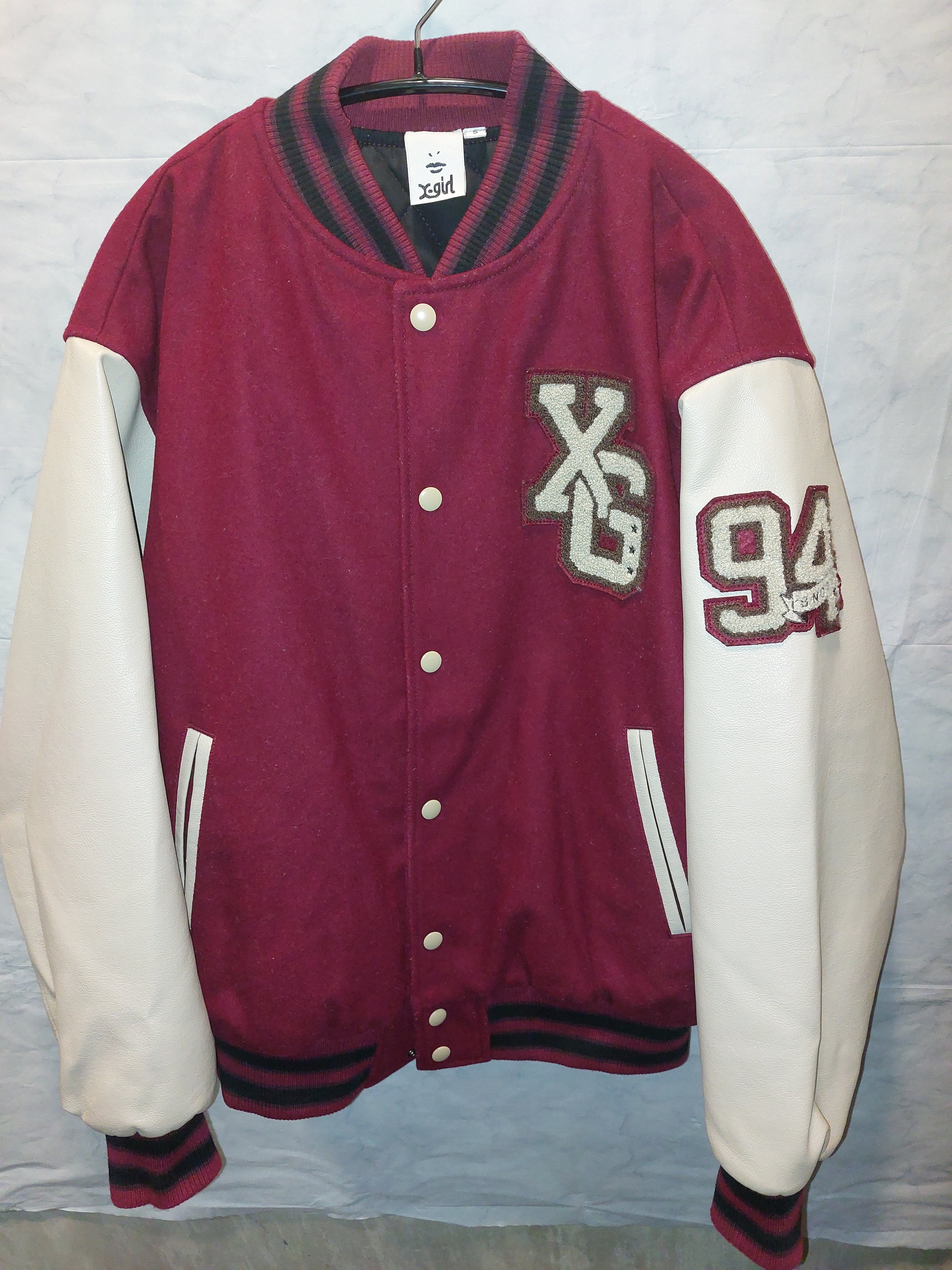 ウールとレザーのコンビネーションで、背面にX-GIRLの刺繍ロゴが施されたスタジャン。